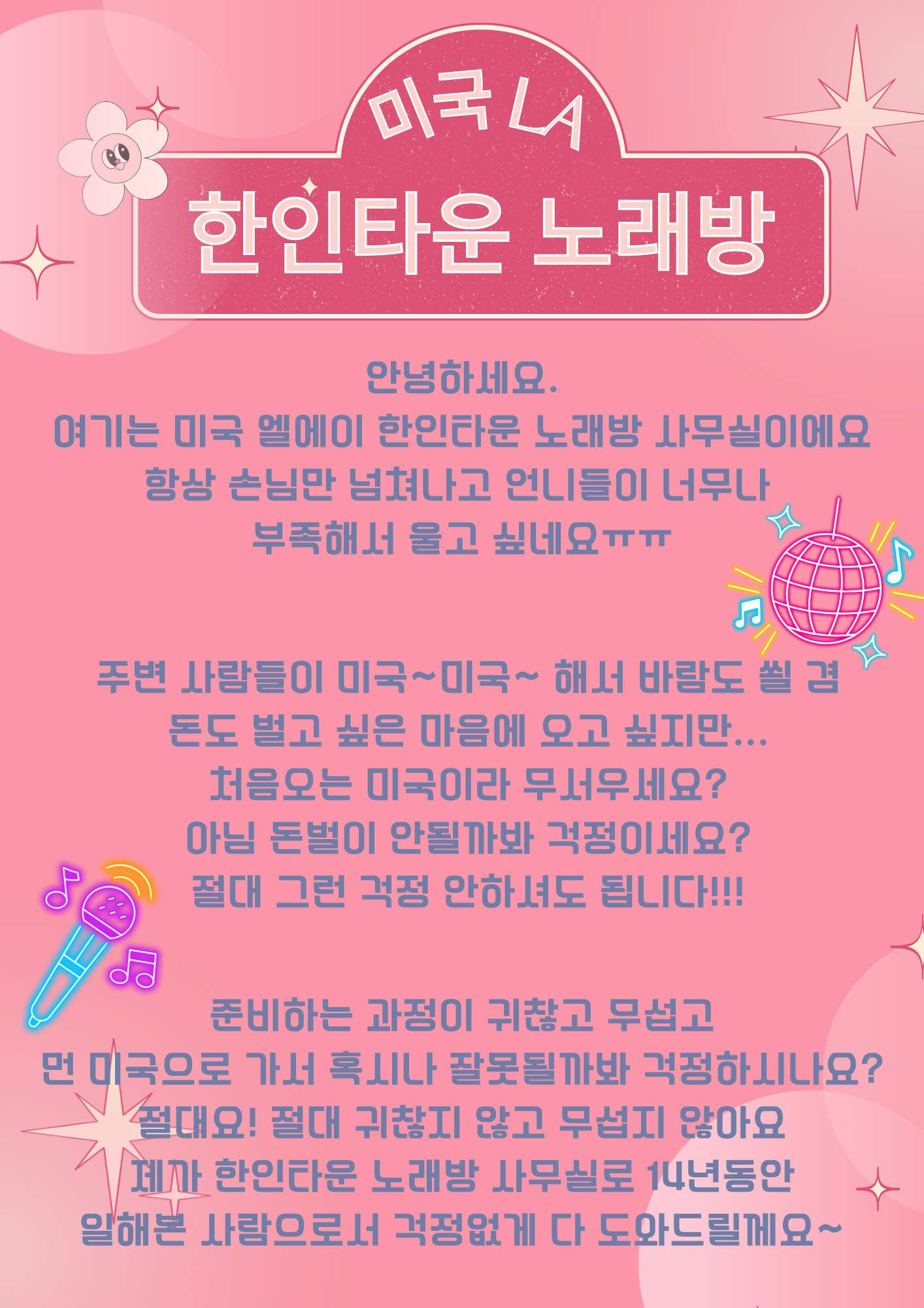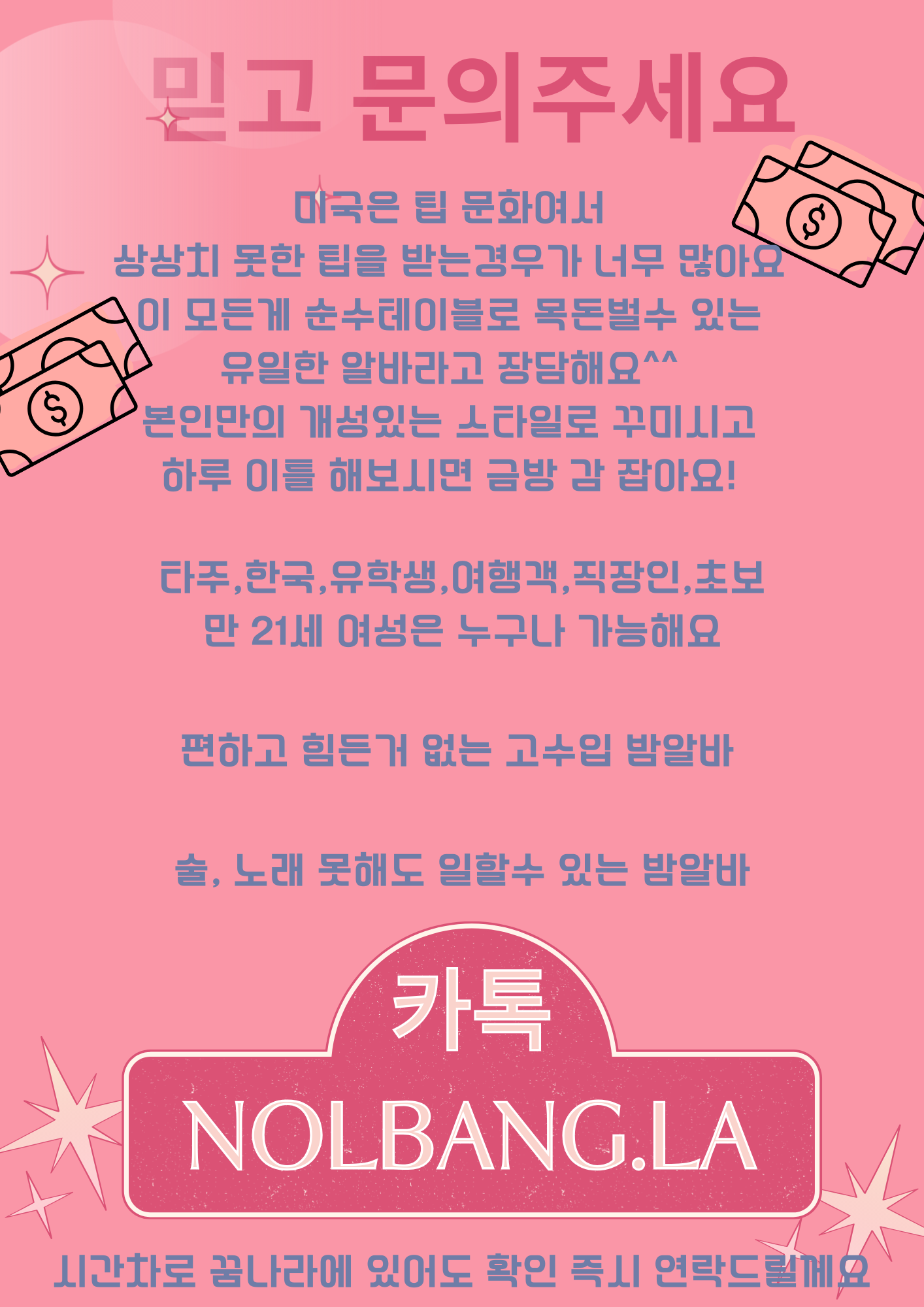 [아르바이트기타] LA 엘에이 노래방 단기 장기 여 밤 알바 // 톡 hanna111 |