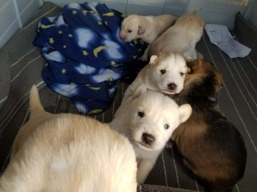 풍산개 어미(순종-신부님이 직접 북한에서 가져옴)가 낳은 새끼들입니다.