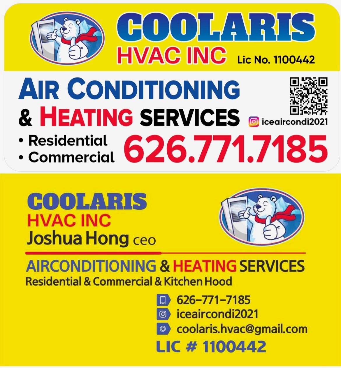 안녕하세요! 오랜 HVAC 경력과 기술로 믿을 수 있고 ✅에어컨 • 히터 • 덕트 설치 & 수리 냉•난방 시스템만 전문적으로 하고 있는 Coolaris Hvac Inc의 자슈아 홍입니다. 전화 주시면 과잉 진단 없이 정직한 서비스와 친절한 안내로 응대 해드리겠습니다. 감사합니다. ✅Licensed and fully insured.( general liability & workers comp) Joshua Hong :626-771-7185 LIC (HVAC라이센스No.)1100442 & EPA자격증No.931244052110(프레온가스 냉매제 주입/처리) *****냉매제(프레온 가스)주입은 EPA자격증이 있어야 합니다.자격증 없는 사람의 주입은 불법입니다. 가스주입시 자격증 꼭 확인해주세요*****